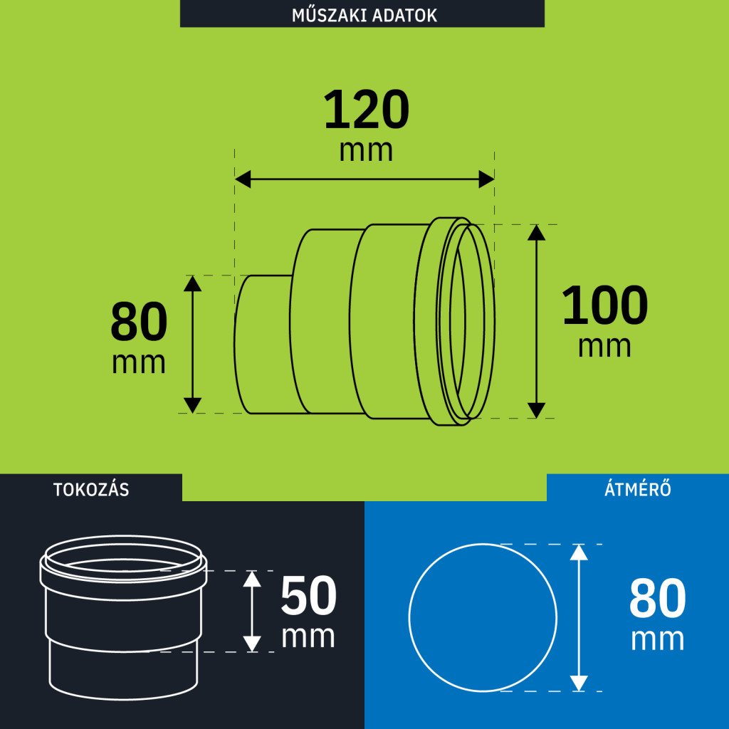 Anyag: PPs - speciális műanyagSzín: fehérHőmérsékleti osztály: maximum 120°C (T120)Nyomásosztály: H1 (5000Pa)Éghető anyagtól való távolság: 10mmGyártó: I.G.C. STROJAL s.r.o.