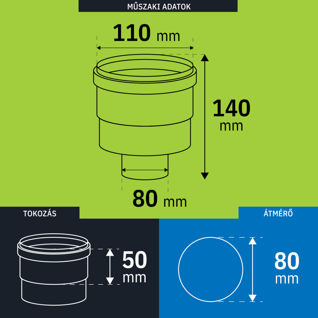 Anyag: PPs - speciális műanyagSzín: fehérHőmérsékleti osztály: maximum 120°C (T120)Nyomásosztály: H1 (5000Pa)Éghető anyagtól való távolság: 10mmGyártó: I.G.C. STROJAL s.r.o.
