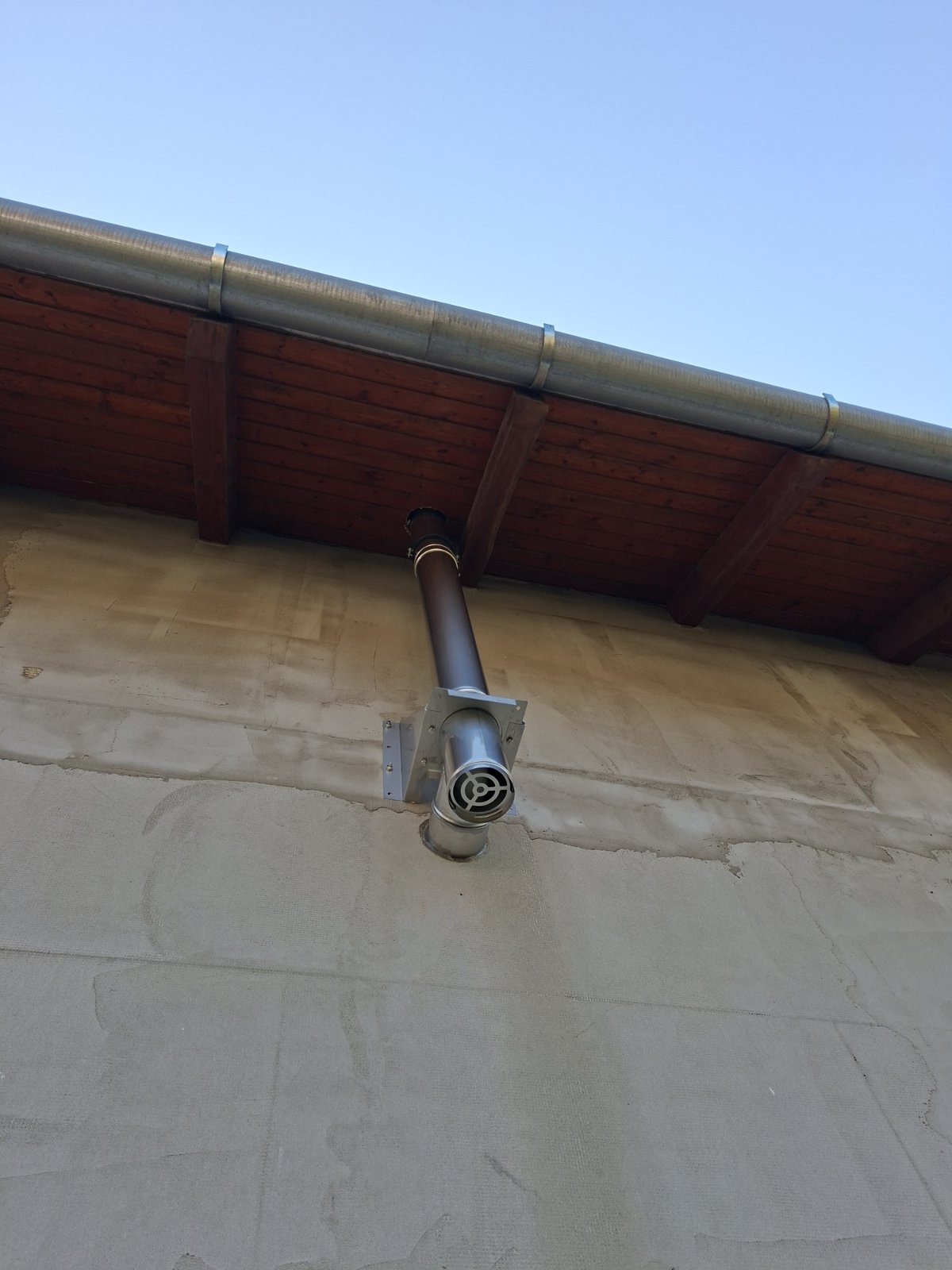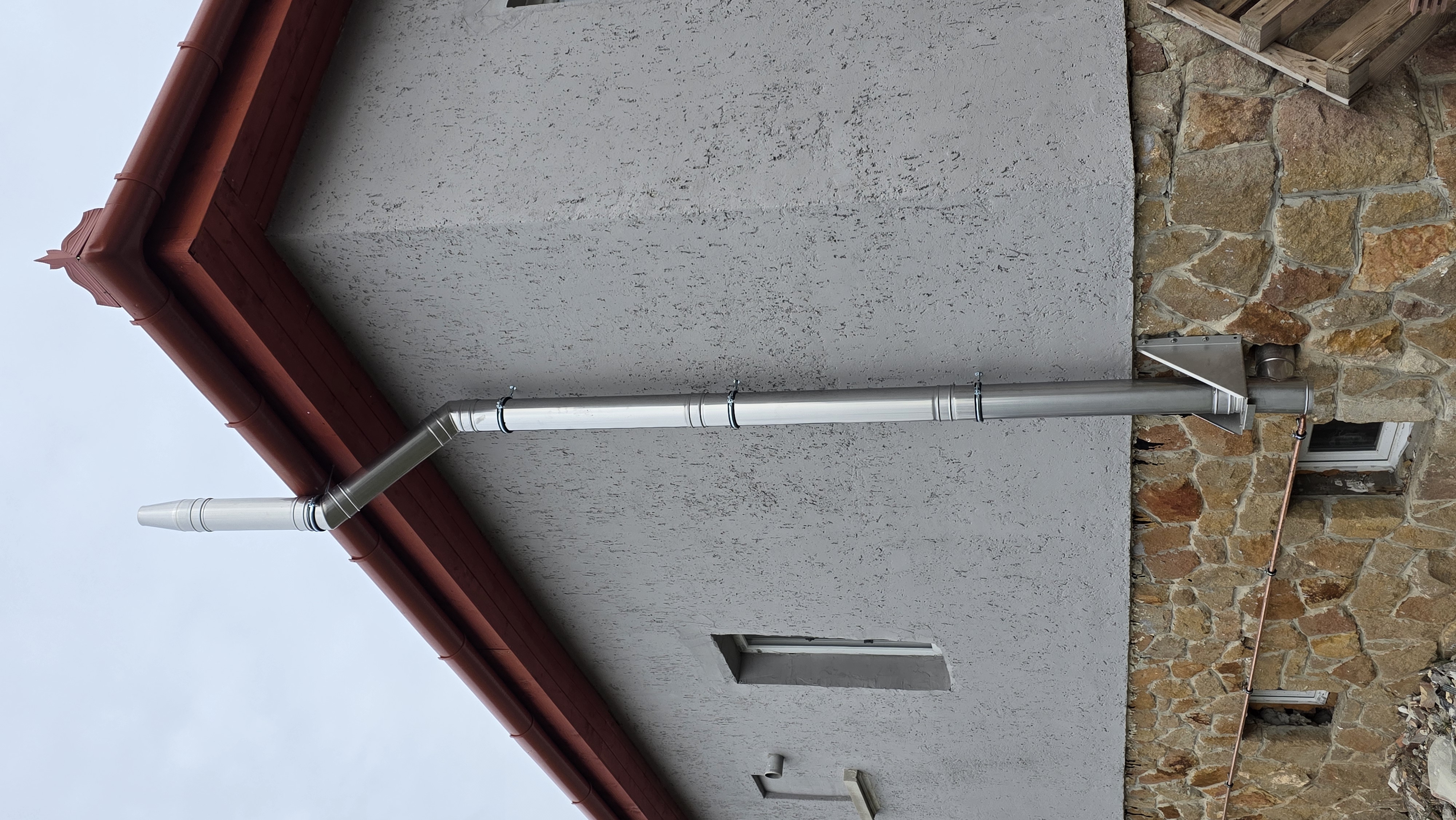 Erre az anyagváltásra a legtöbbször akkor kerül sor, amikor a meglévő kürtőnk elhúzást tartalmaz és ezzel egyidejűleg túl hosszú is a vezetési hossz a méretezés szerint. Mivel a PPs flexibilis cső felületi érdessége sokkal nagyobb, mint az INOX flexibilis csőé, így az utóbbival folytatjuk a megkezdett PPs/Alu rendszert. Ilyenkor már a talpas könyökünk is INOX kell legyen, valamint a kürtőfedélnek is.